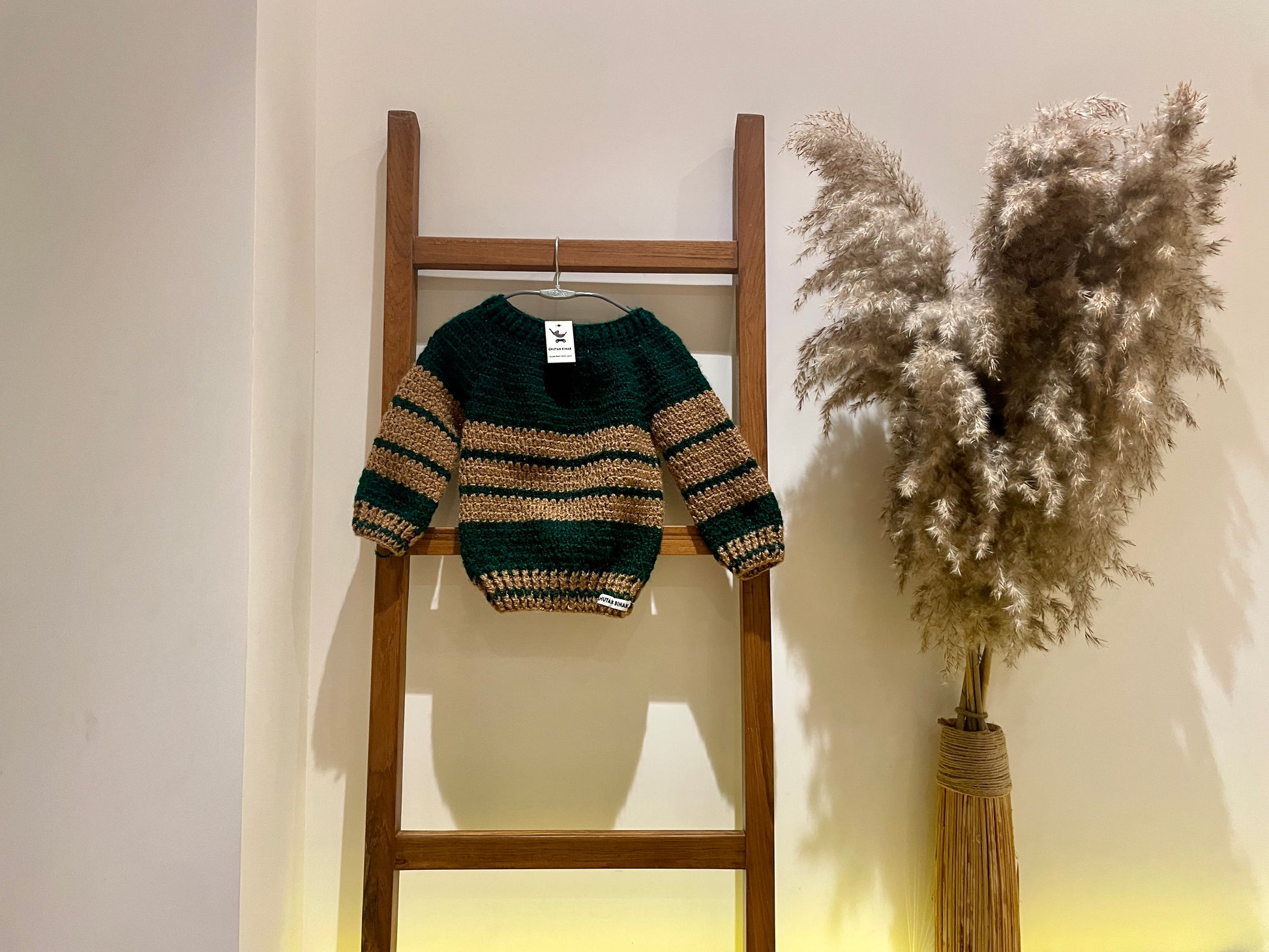 Get ready for fall with our Autumn Stripes Kids Sweater by Chutak Binak! Hand-knit with dark green and brown stripes, this sweater is both elegant and comfortable. Perfect for keeping your little ones warm and stylish during the cooler months. Don't miss out on this one-of-a-kind piece!