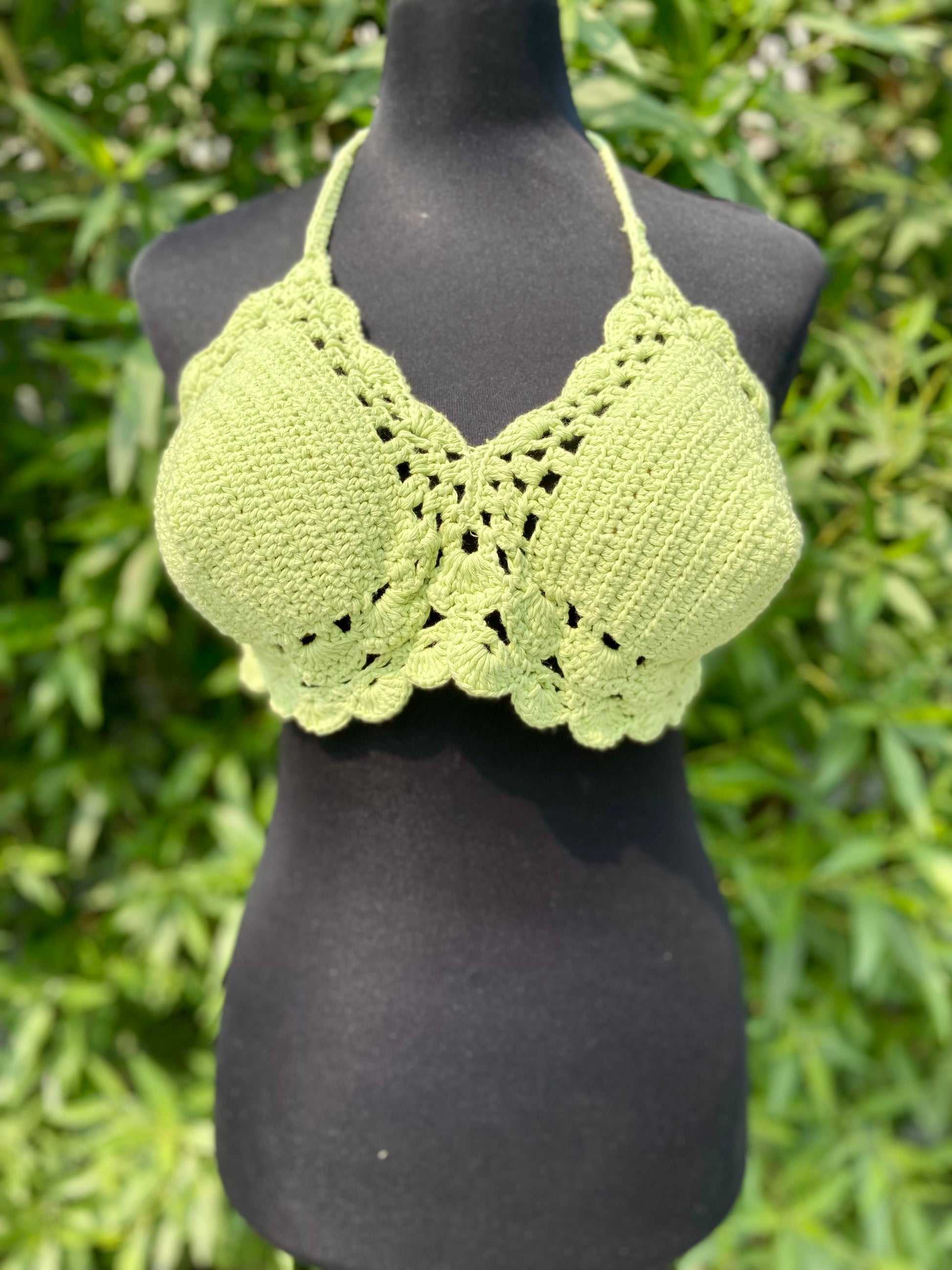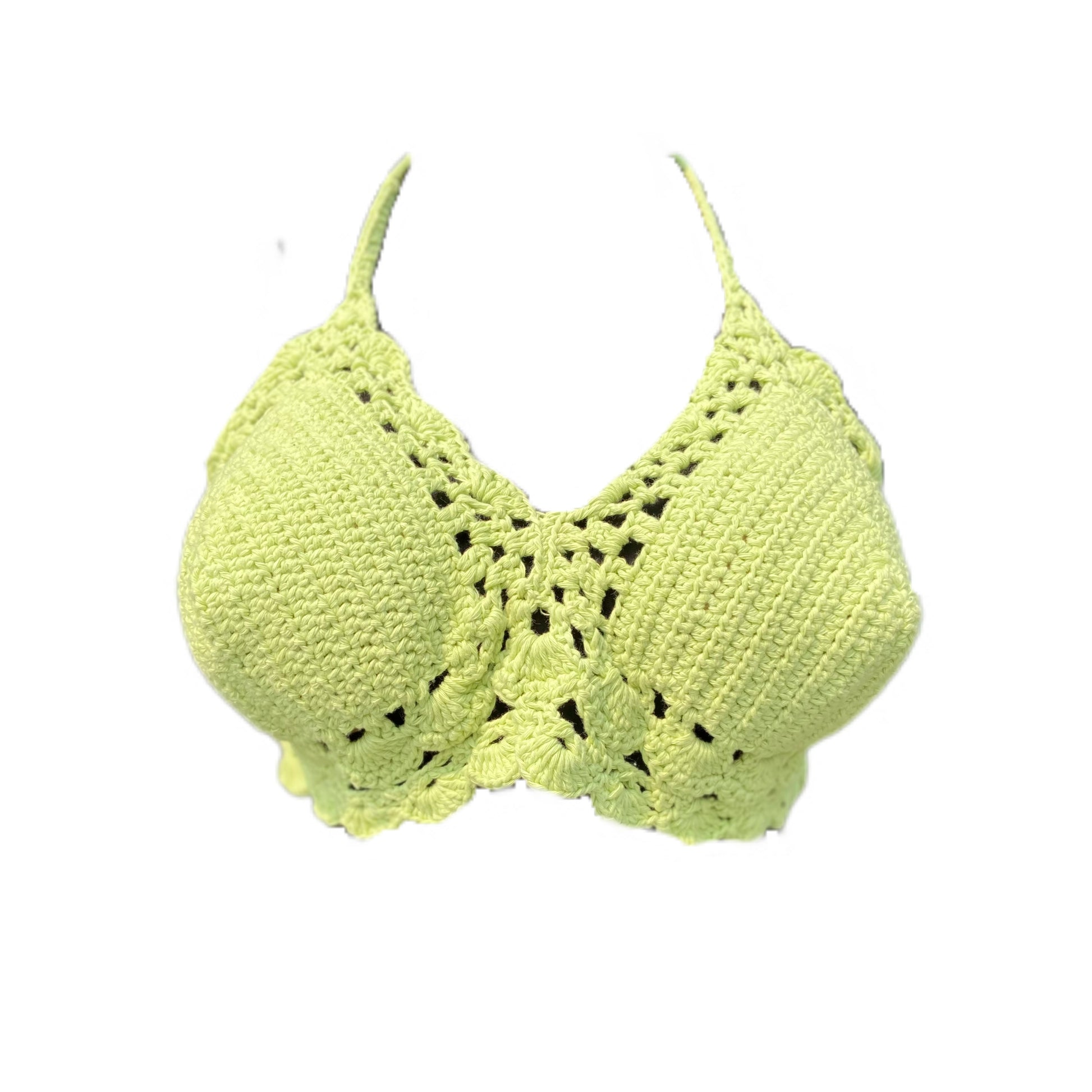 Unleash your inner beach goddess with our Handmade Pastel Green Crochet Bralette. Made with soft cotton that is both sexy and comfortable. Perfect for adding a pop of color to your beach vibes and showing off your diva side. Fly high and free like a forest goddess in this unique and beautiful bralette.