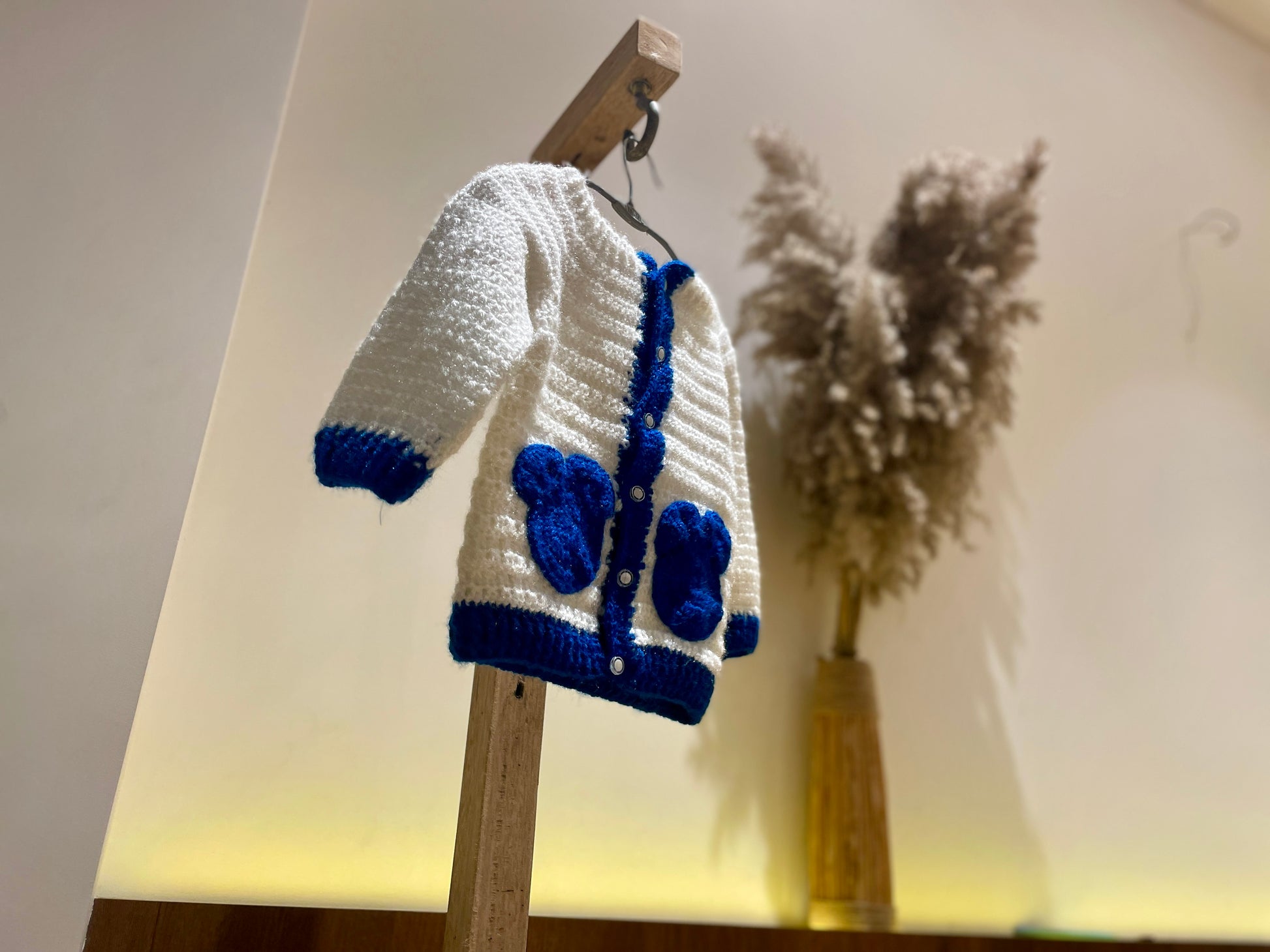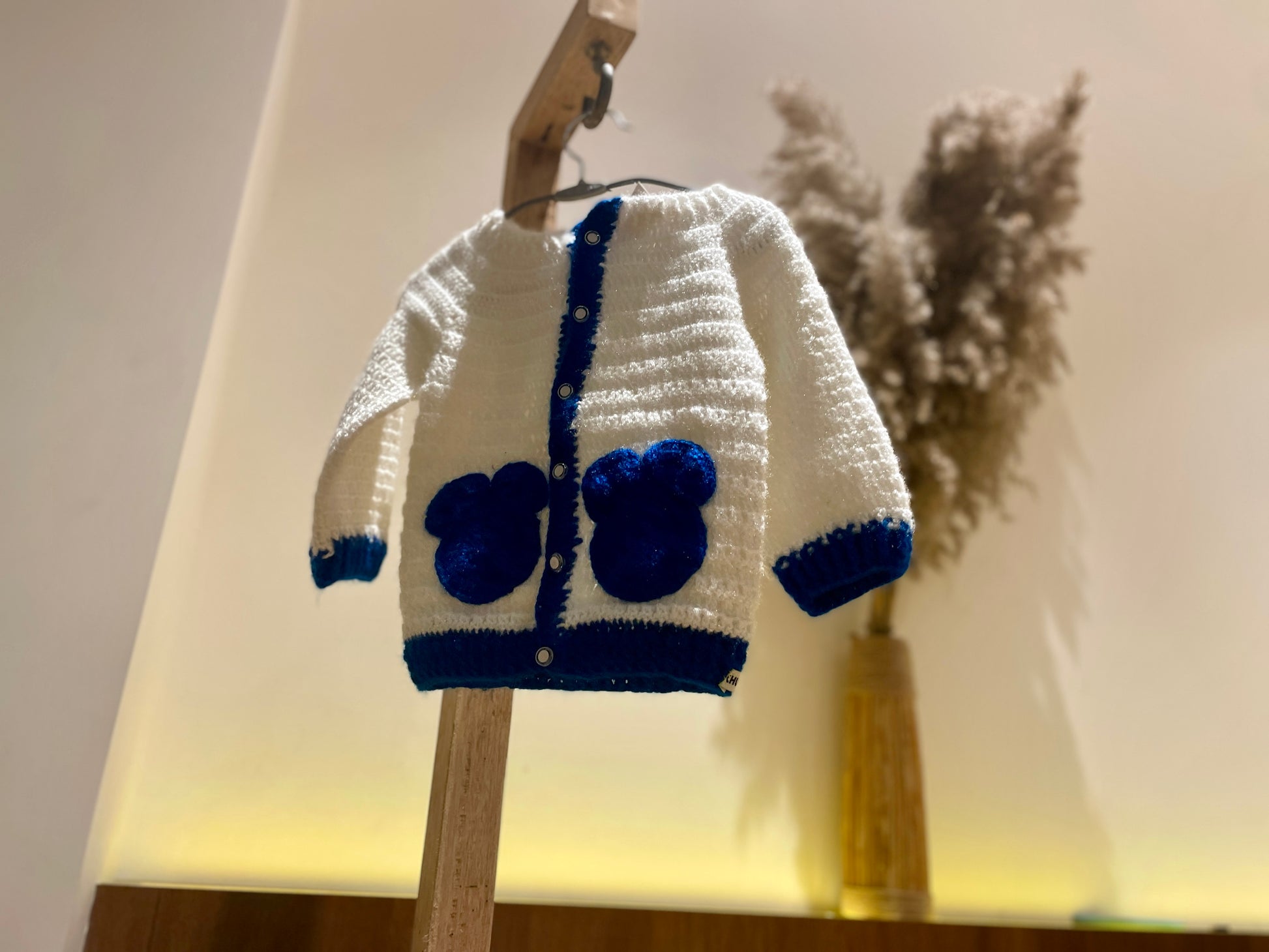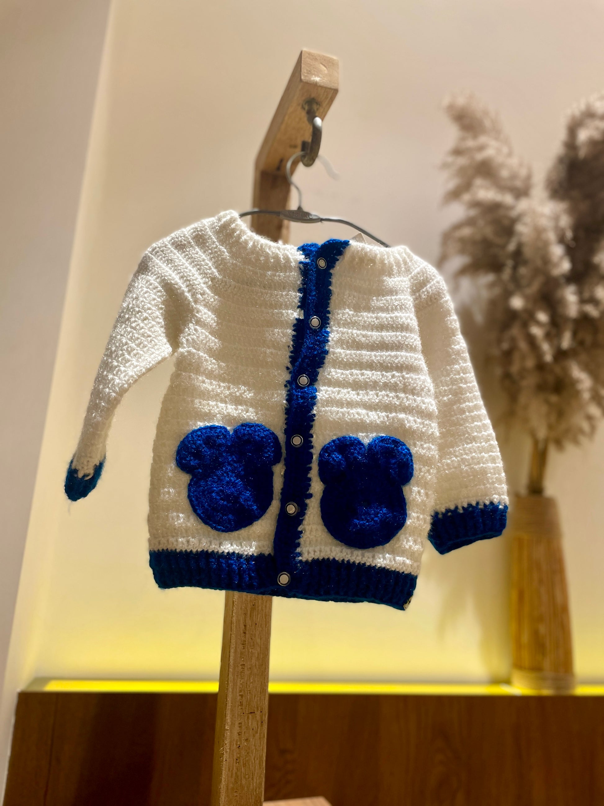 Snuggle up in cuteness! π This hand-crocheted white and royal blue toddler cardigan is as cozy as it is adorable, featuring fuzzy bear-shaped pockets and shiny snap buttons down the front. Perfect for keeping your little cub warm in style! π§Έβ¨