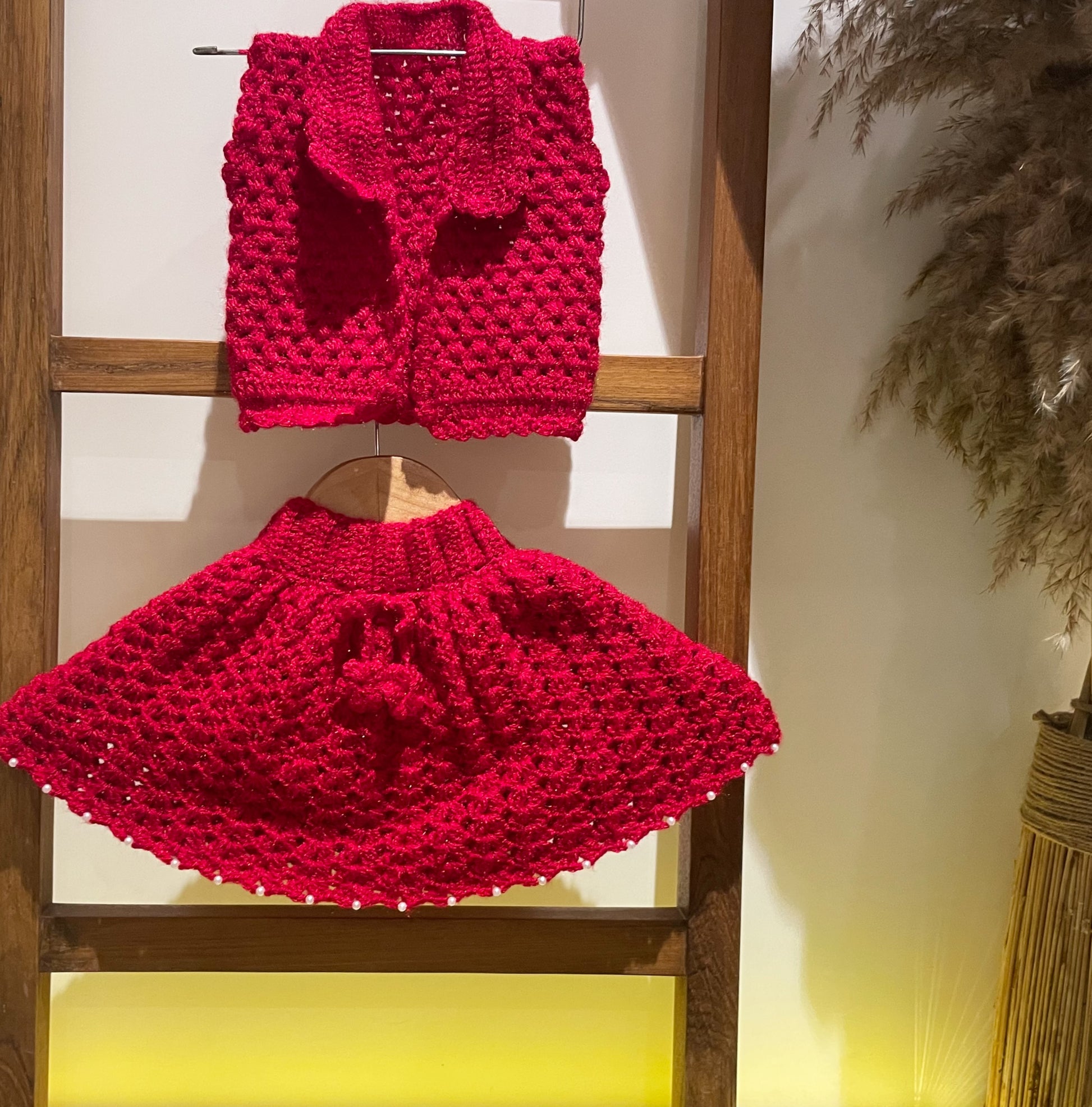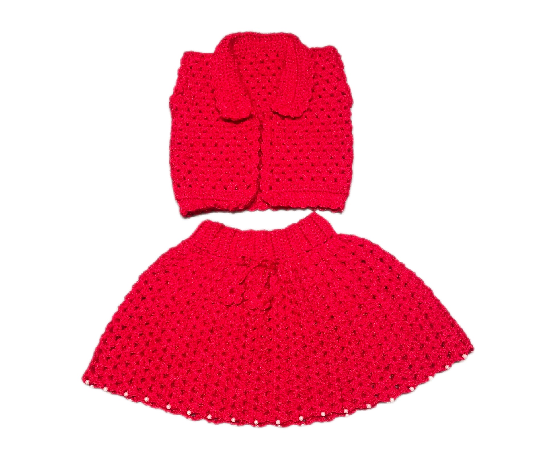 Dress your little one in this playful Crochet Jacket and Skirt Set, perfect for party wear! Made for girls aged 12-18 months, this set features a cute crochet design that will have your child looking stylish and comfortable. (No need to break the bank for a cute outfit!)