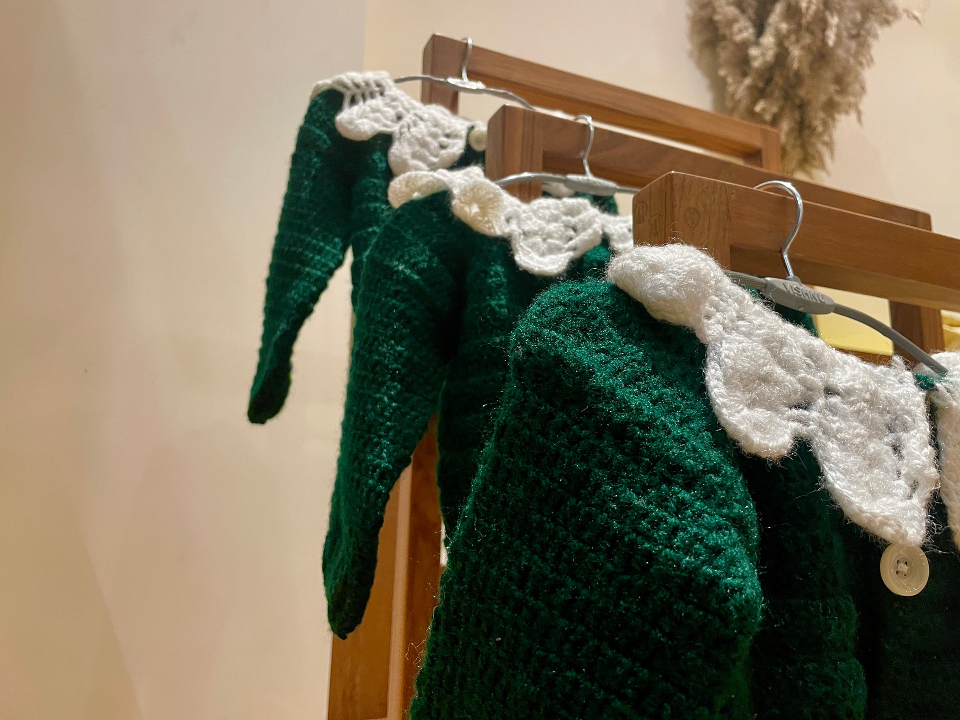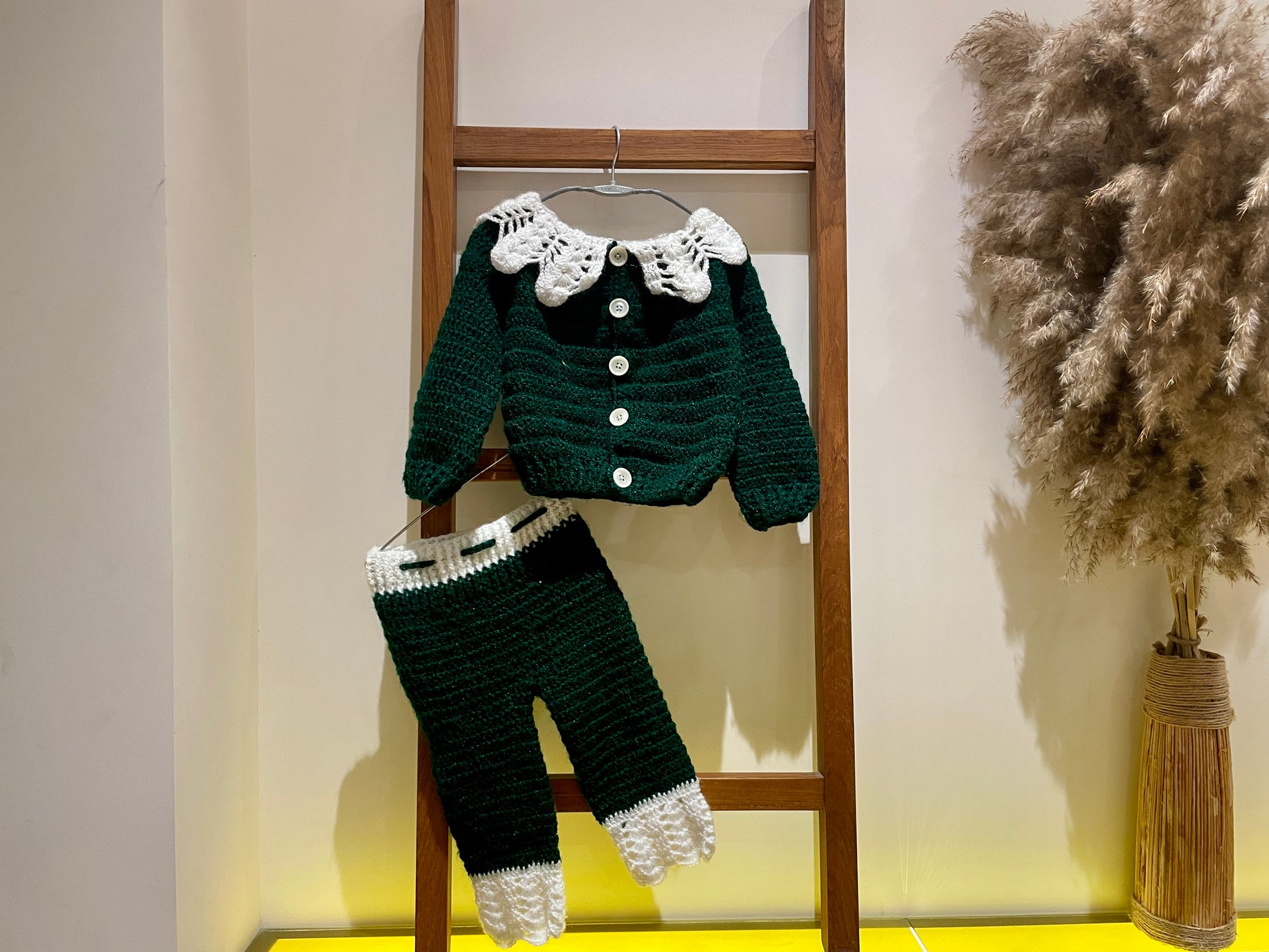 Unleash your inner charm with our Emerald Charm Outfit Set! This unique hand-knit top and bottom set is perfect for anyone looking to make a statement. Versatile and unisex, this set is sure to add a touch of quirkiness to your wardrobe. (Limited quantities available!)