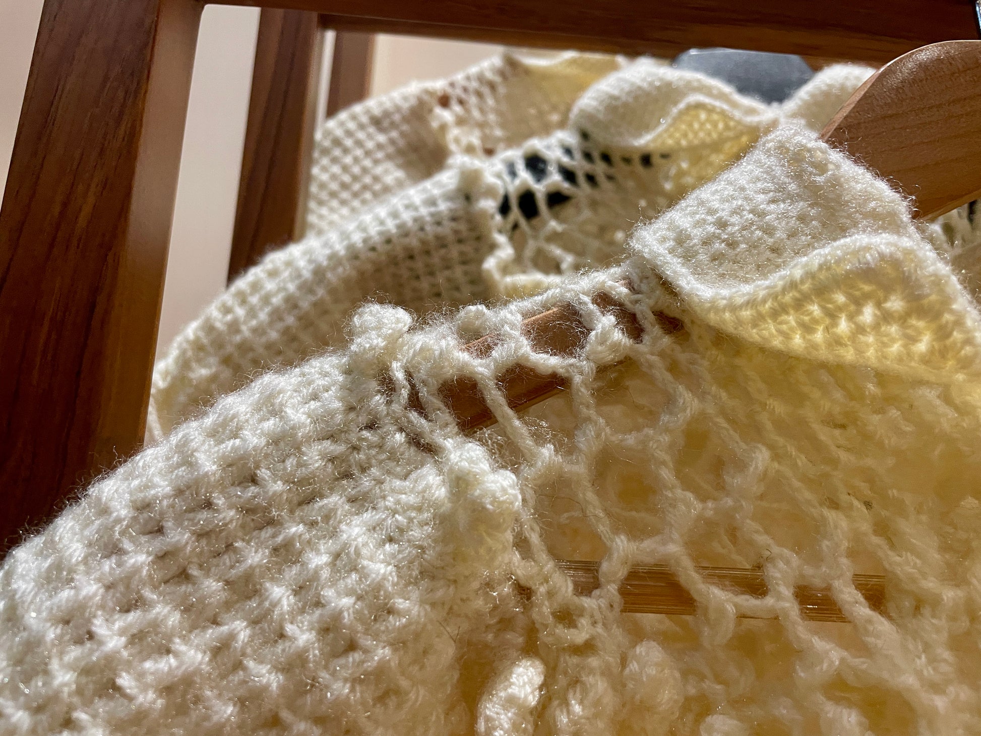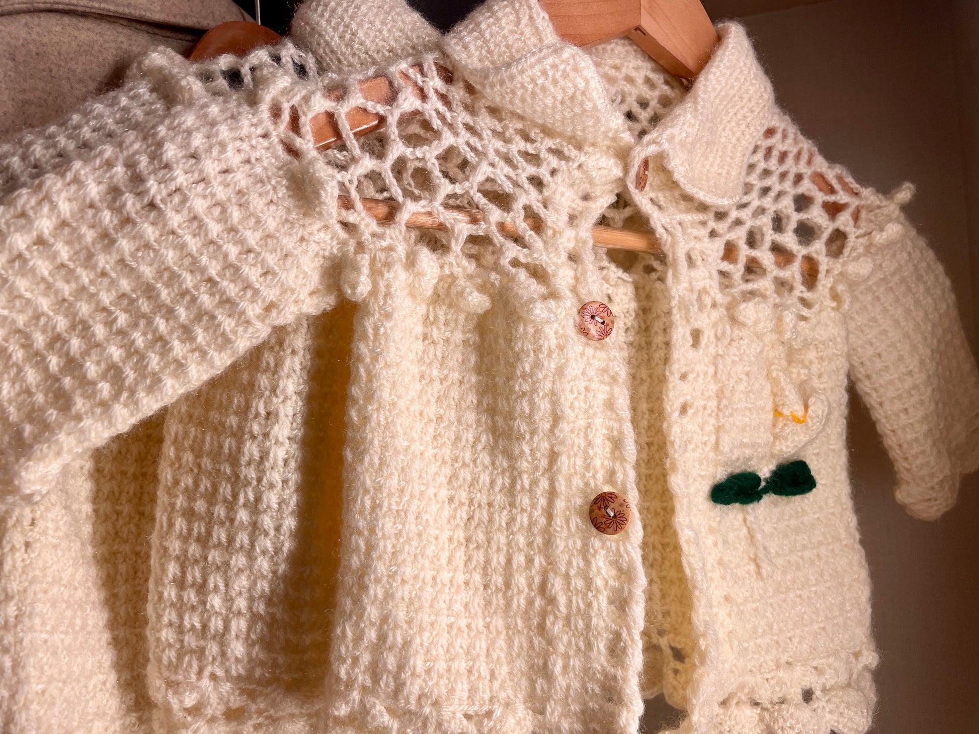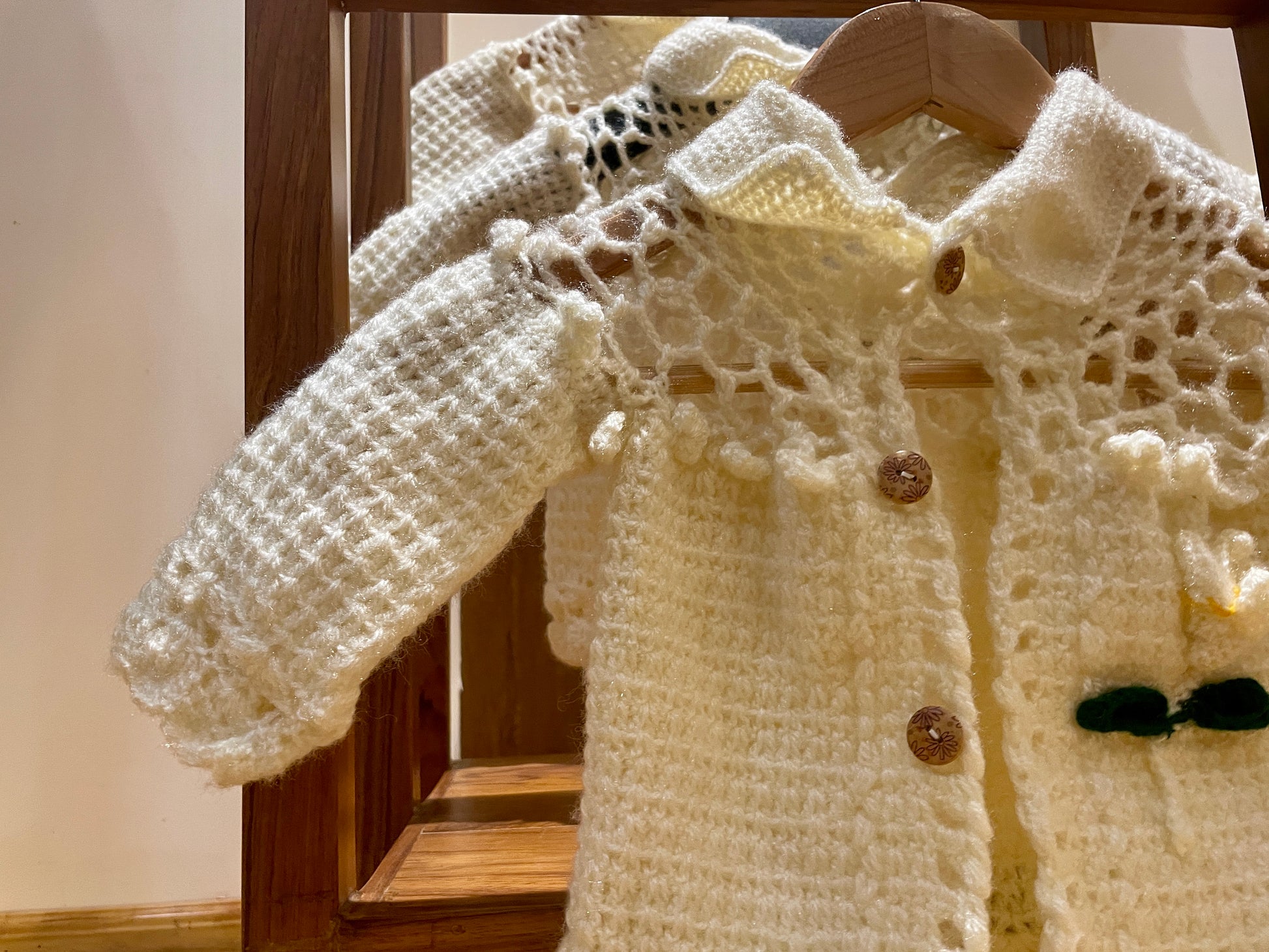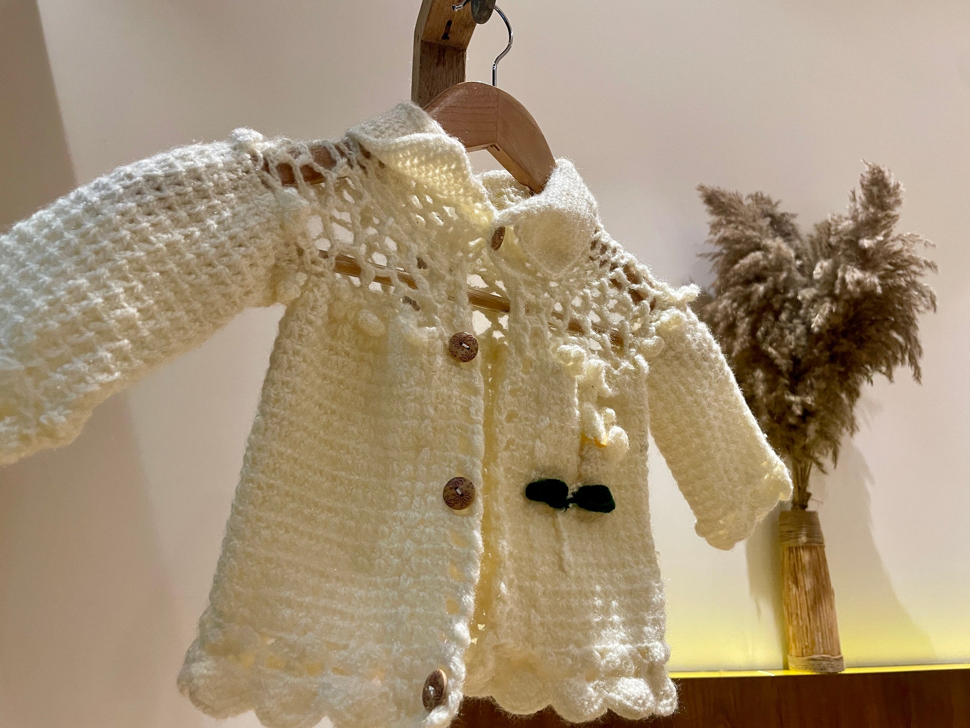 This handmade off white cardigan features a delicate lace-knit design with a charming collar and intricate button detailing. Perfect for keeping your little one cozy while adding a touch of vintage elegance to their outfit.