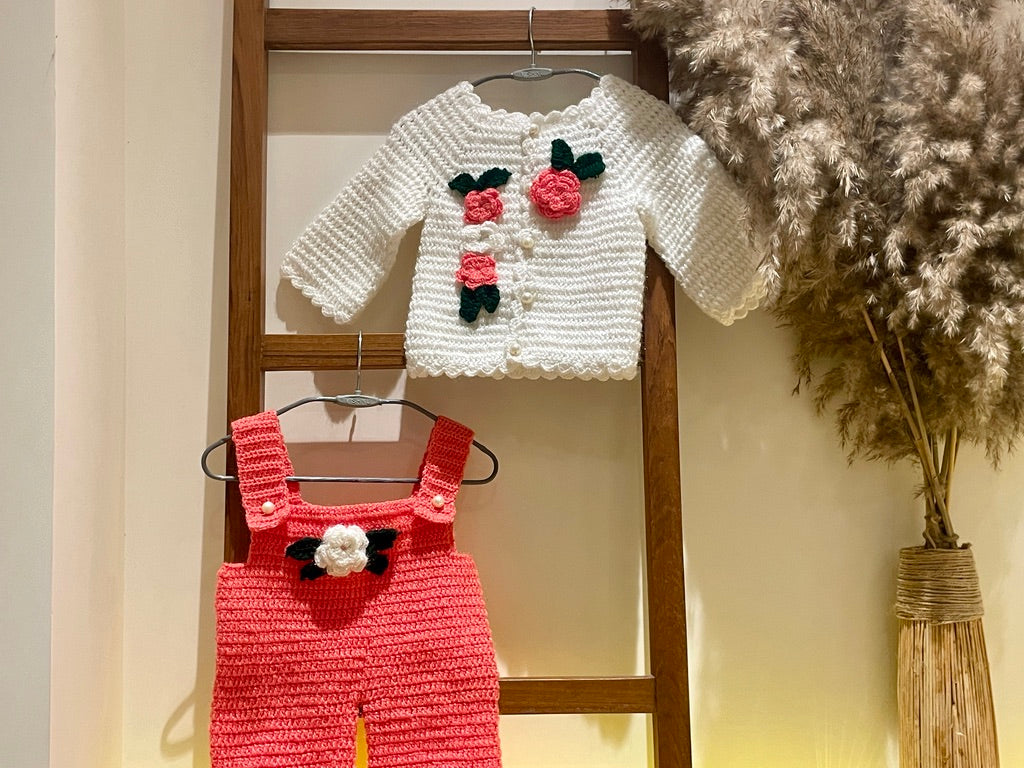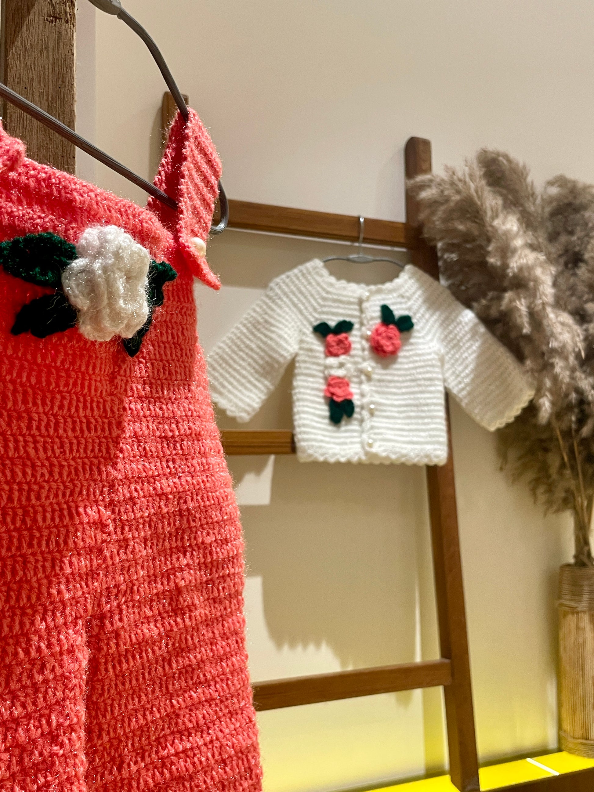 Stay cozy and stylish in our hand-knit unisex dungaree, perfect for any occasion! Each piece is lovingly made with care, ensuring both comfort and durability. Embrace your unique style with our playful and quirky blossom dungaree. (And yes, it has pockets!)