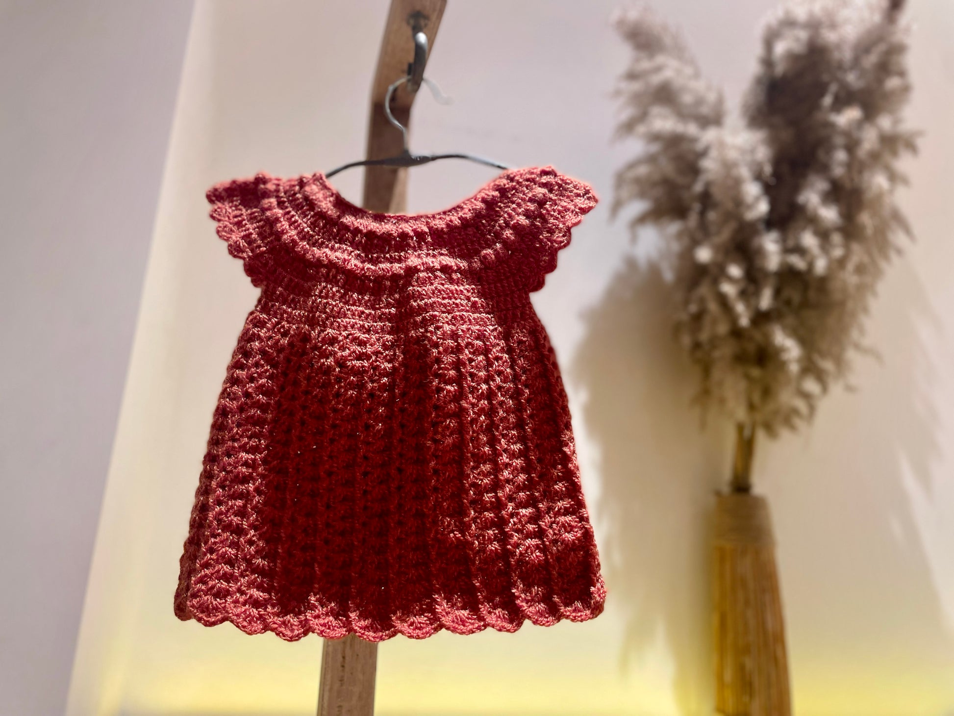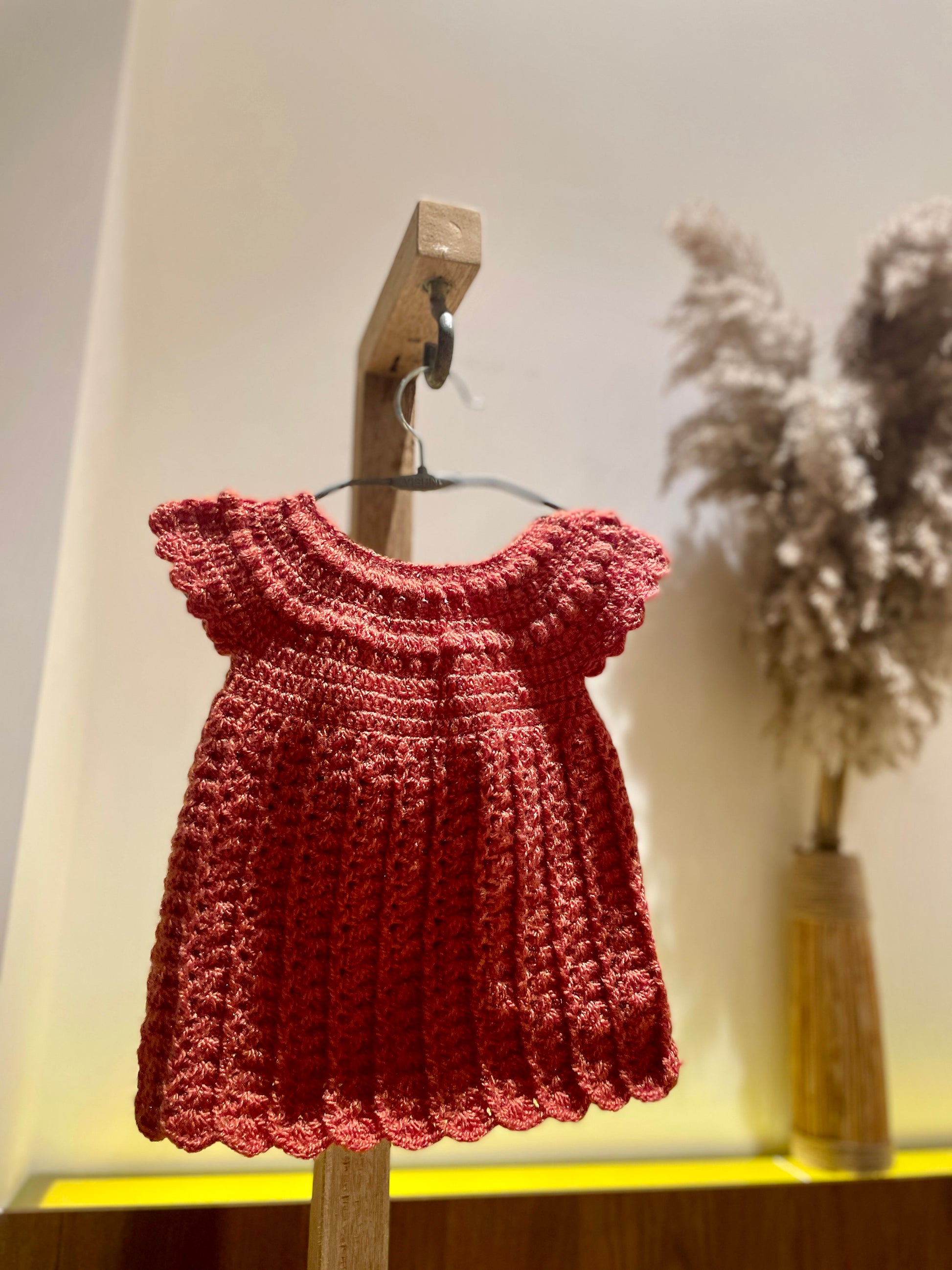 Twirl into charm! 🍓 This hand-crocheted maroon frock is a dainty delight with its scalloped edges, fluttery sleeves, and vintage-inspired stitchwork. Perfect for your little darling to shine at any outing—cute, cozy, and full of love in every loop! 💕👶✨